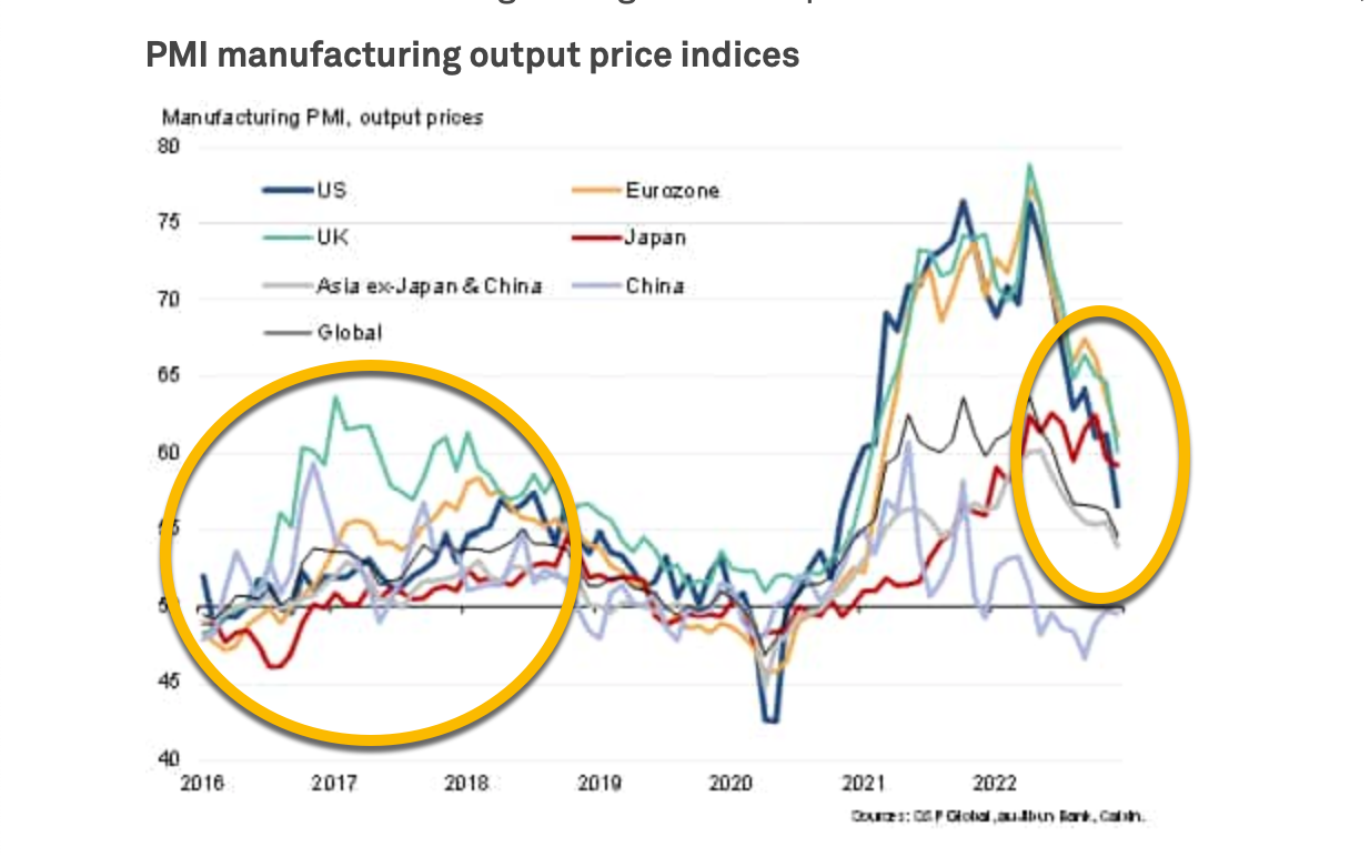 The peak inflation narrative from the end of 2022 is starting to look like it is justified. The inflation picture is easing across the world. This was clear in the December PMI reports released by S&P Global earlier this week. Manufacturing input prices around the world are coming down, as you can see in the chart below, and that is to be celebrated.